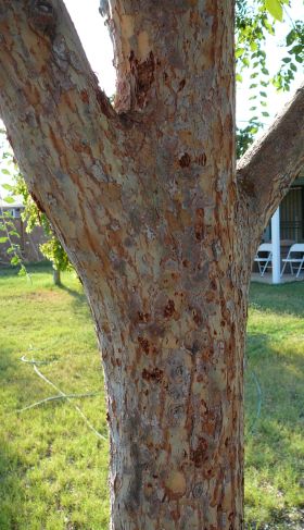Because cellulose doesn't branch or coil at all, individual strands of it are able to snuggle up next to each other in a tightly packed configuration that's very strong. The hydroxyl (OH) groups on one strand of cellulose form hydrogen bonds with the OH groups on adjacent strands, forming cellulose structures that are tough and rigid. Plants use cellulose as a structural material in their cell membranes. Wood is rigid because it's made primarily from cellulose. It's hard to believe, but even the dry parts of the Chinese Elm tree trunk shown above are almost exclusively made from carbon dioxide and water that's been re-arranged into cellulose. The widespread use of cellulose in the plant kingdom makes it the most abundant organic compound on the planet.
