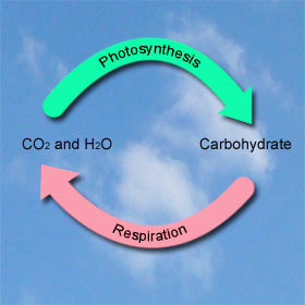 Respiration reverses this process, using the stored energy for biological functions. It breaks catbohydrates down into water and carbon dioxide, which completes the cycle.