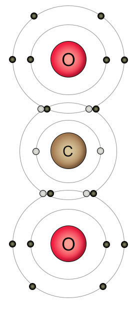 Plants get their carbon from carbon dioxide molecules in the atmosphere. Carbon atoms form double bonds with oxygen atoms because they are both looking to fill their outer shells. Two oxygen atoms fill the outer shell of one carbon atom while the carbon atom simultaneously fills the outer shells of both oxygen atoms. The result is a molecule of carbon dioxide, where all of the atoms have full shells.
