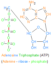 This ATP molecule contains three phosphate groups that are chemically bound to each other. Hydrolysis is used to sever the bonds between the phosphate groups, which then releases the energy required for biological processes. This transforms ATP into two molecules; inorganic phosphate and ADP. |