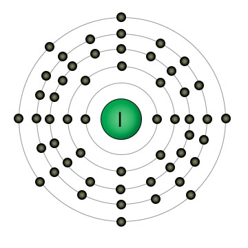 Iodine (I) is the largest biologically useful atom in plants and animals. It has 53 protons and 53 electrons. It organizes it's 53 electrons into five electron shells. The inner four shells are full, but it's outer (fifth) shell (which can contain up to 50 electrons), has only seven electrons. The fifth shell divides it's electrons into two suborbitals, starting with "s", which contains a maximum of two electrons, then "p", which can contain a maximum of six electrons. The other fifth shell suborbitals are empty. With seven electrons in iodine's outer shell, it's "s" suborbital is full, and it's "p" suborbital (which contains five electrons) needs a sixth to be full.