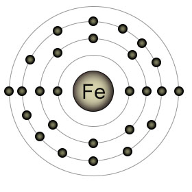 Iron (Fe) has an atomic number of twenty six. It has two electrons in it's outer (4th) shell. It's 3rd shell is partially full, with six (out of a possible ten) electrons. This is because the S suborbital of the 4th shell fills before the D suborbital of the 3rd shell. Elemental iron is reactive, and is usually found in one of two ionic forms (also called oxidative states); Fe2+ (with it's 4th shell emptied), or Fe3+ (with an additional lost electron, this time from the D orbital of the 3rd shell).