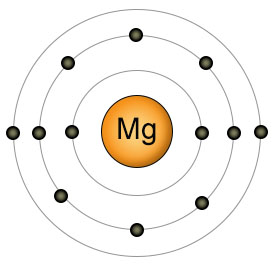Magnesium (Mg) has twelve protons and twelve electrons. It has two electrons in it's valence (3rd) shell. It's highly reactive, so it's not found in it's elemental form in nature. Like calcium, it likes to get rid of it's two outer electrons, becoming Mg2+. Also like calcium, Magnesium must be aborbed by plants in it's individual ionic form (Mg2+). Plants can't absorb it when it's bound to other substances.