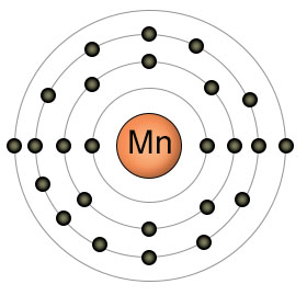 Manganese has an atomic number of twenty five. It has a partially filled 3rd shell with thirteen electrons, and two electrons in it's 4th (outer) shell. Manganese is in it's most stable (and biologically useful) state as Mn2+, when it has given up both of the electrons in it's 4th shell.