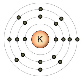 Potassium (P) has an atomic number of 19. It has only one electron in it's outer shell, so it's looking to give it away. Potassium shares many similar qualities with sodium. While sodium has eleven protons and electrons, compared to potassium's nineteen, they both have only one electron in their outer shells. Sodium has three shells, while potassium has four. They are both chemically reactive with water, and they both have nutritional value as positive ions. Despite their similarities, sodium and potassium are different chemical elements, so they can and are used against each other by the cell for purposes of diffusion through concentration differences.