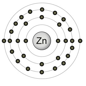 Zinc has an atomic number of thirty. It has a full 3rd shell, and two electrons in it's 4th (outer) shell. It's most commonly found in it's ionic state (Zn2+), since it likes to empty it's 4th shell of it's two outer electrons. This ionic condition, however, sets it's 4th shell up to recieve four pair of electrons from four other atoms, usually nitrogen, sulphur, or oxygen. These four coordinated covalent bonds position zinc in the active site of many enzymes, where it plays both catalytic and structural roles.