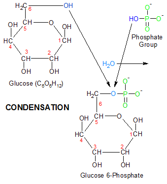 Due to hexokinase's positioning of the ATP and glucose molecules, the OH group on the newly freed phosphoral group immediately comes into contact with the OH group that's attached to the carbon-6 atom on the glucose molecule. These two OH groups react in a process called condensation. Both of the hydrogen atoms and one of the two oxygen atoms combine to form a molecule of water (H2O), which is discarded. The remaining oxygen atom forms a bond that links the phosphoryl group to glucose, creating glucose-6-phosphate. This completes the process by which energy obtained from the breaking apart of one molecule is used to synthesize the creation of a new molecule.