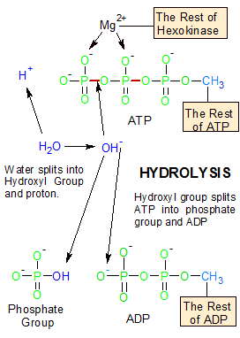 Figure 5 - The MG2+ ion in hexokinases' active site weakens the PO bond, which enables the hydrolysis (OH-) group to sever it. The OH group attaches to the phosphorus atom while the extra electron attaches to the oxygen atom that stays with the ADP molecule. |