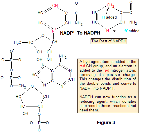 NADH and NADPH are identical molecules except for the addition of a phosphate group (PO3) to one of the nucleotides on NADPH. They each accept two additional electrons by adding a hydrogen atom and a free electron to their earlier forms (NAD+ and NADP+). Figure 5 shows the transition of NADP+ to NADPH. They differ from ATP in that they don't transfer phosphate groups.