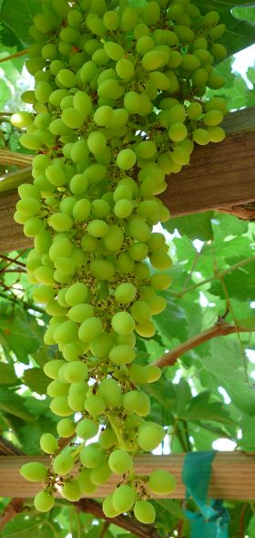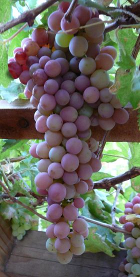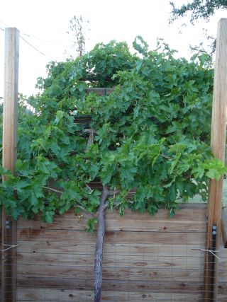 Grapes love the summer sun, and their large leaves will give you shade all summer. Unless, of course, you get an infestation of White Flies. They don't show up on my grape leaves until late June, after the grapes are ripe, but when they do, there's lots of them. They don't bother the grapes, but they kill the leaves by sucking all the juice out of them. By mid August, all of the original leaves are dead and falling off. The grape vine seems to make a comeback in late August, with lots of new leaves. I still see white flies, but the grape vines now seem to have the upper hand.