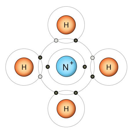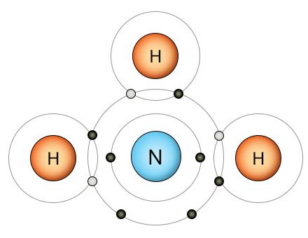 Nitrogenase breaks the triple bonds of the N2 molecule and replaces each bond with a hydrogen atom. This results in the ammonia molecule above. A proton (H+) takes one of ammonia's two free electrons to become a hydrogen atom, then forms a fourth covalent bond with the last free electron. This creates the ammonium ion we see below.
