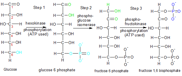 STEP 1: The hexokinase enzyme starts glycolysis when it phosphorylates a molecule of glucose. It aquires the phosphate group from an ATP molecule, converting it to ADP in the process. Glucose is routinely phosphorylated when it enters a cell because the attached phosphate group keeps it from exiting the cell. The changes made in step one are highlighted in light blue and the carbons are numbered with red digits. Now that it's glucose 6-phosphate, it's ready for the second step of glycolysis.