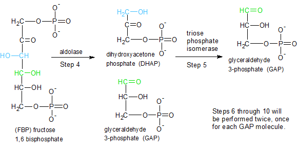 STEP 4: The aldolase enzyme splits fructose 1,6 bisphosphate into two molecules. Glyceraldehyde 3-phosphate (GAP) is ready to proceed to step six, but the dihydroxyacetone phosphate (DHAP) molecule needs more work done on it.
