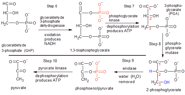 Figure 3 - Steps 6 through 10: This is where the payoff occurs. For an investment of one glucose and two ATP molecules, we get four ATP, two NADH, and two pyruvate molecules. |