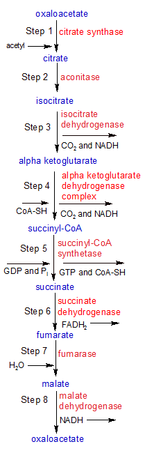 The third stage of respiration is called the citric acid cycle (aka the Krebs or TCA cycle). The citric acid cycle takes place in the mitochondria of eucaryotic cells and starts with one oxaloacetate and one acetyl-CoA molecule. By the end of each cycle it has discarded two molecules of CO2 as waste, created five energy carrier molecules (one each of GTP and FADH2, plus three NADH), and ended up with it's original molecule of oxaloacetate.