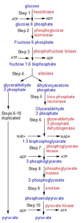 The flowchart above maps out the ten steps of glycolysis. One molecule of glucose enters glycolysis, and two molecules of pyruvate leave it. Note that steps 6-10 are completed twice because two molecules of G3P were created in steps 4 and 5. The substrates are blue and the enzymes are red.