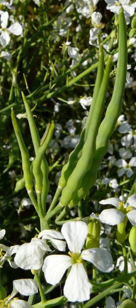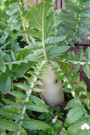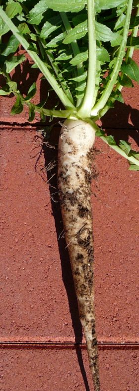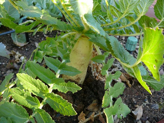 The photo above shows a mature Daikon radish pushing up out of the ground as it grows. It's normal for this to happen to some extent, but becomes more pronounced when the soil is hard. The part of the root that's exposed to the sun and air can become damaged and inedible if left exposed for too long.