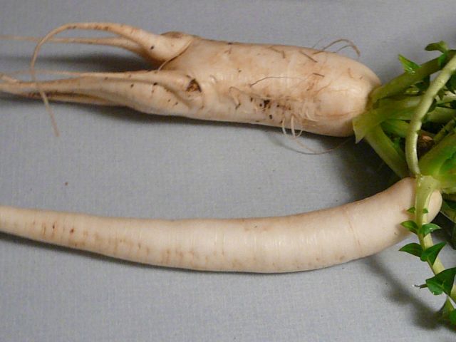 The photo below shows what can happen when root crops run into obstacles. The top Daikon radish was growing fine in loose soil, but had the misfortune of being planted above a length of PVC pipe that runs under my garden. The root tried to grow around the pipe, but had trouble doing so.