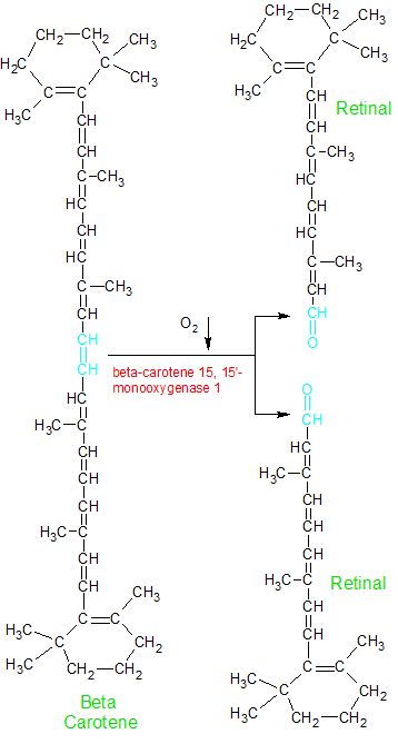 The enzyme beta-carotene 15,15-monooxygenase 1 uses an O2 molecule to split beta carotene into two molecules of retinal. Note retinal's aldehyde group (shown in blue). |