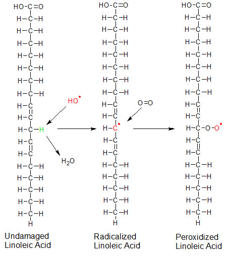 Unsaturated fats are easy targets for free radicals. The double bonds between the unsaturated carbon atoms in the fatty acid chain reduce the strength of the single CH bonds in the adjacent carbons. The hydroxyl radical steals one of the weakly bound hydrogen atoms from the fatty acid chain in the cell membrane and becomes a water molecule. The fatty acid now has a carbon with an unpaired electron, and becomes a free radical itself. It can repair itself if it finds another hydrogen atom. But the carbon atom isn't as strong as an oxygen atom, so it's not as adept at stealing hydrogen atoms as the oxygen-containing molecules are. If a wandering (O2) molecule finds the unpaired electron on the fatty acid chain it will bind to it in a process referred to as lipid peroxidation. This will start a series of chemical reactions that will break apart the fatty acid chain into undesirable pieces, which cause the fat (or oil) to go rancid. Too many of these reactions will interfere with the cell membrane's ability to function properly, and can damage the cell.
