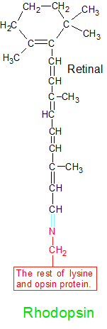 An image further down the page shows part of the structure of the rhodopsin molecule. Retinal's aldehyde group combines with a lysine amino acid (the red portion) on the opsin protein in a condensation reaction that creates a rhodopsin molecule. Retinal's oxygen atom is discarded, and its terminal carbon atom forms a double bond with lysine's nitrogen atom.