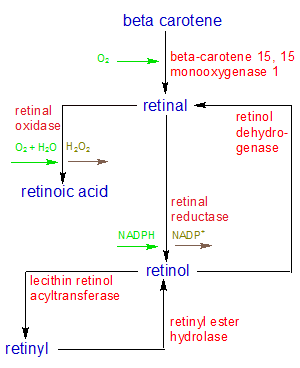 Several different fatty acids (including palmitic, linoleic, oleic, and stearic acids) can be used when synthesizing retinyl, so retinyl refers to a group of different molecules that all store retinol in a stable, fat soluble form. They have names like retinyl palmitate and retinyl acetate, depending on the attached acid. Lecithin retinol acyltransferase combines (esterifies) retinol with a fatty acid to form a retinyl molecule, while retinyl ester hydrolase converts retinyl back into retinol. Some retinyl is stored in fat cells, but over 90% of it is stored in the liver, where they are created. Retinyl is the main form in which vitamin A is consumed when we eat meat (especially liver), because the animals we eat also store their vitamin A as retinyl. Our intestine can't aborb retinyl, though, so it's broken apart and absorbed as retinol, then recombined into retinyl in the liver.