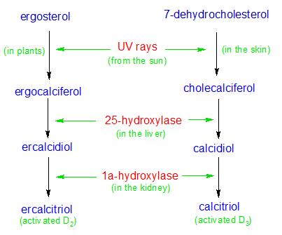 The series of biological reactions that result in the creation of vitamin D in humans begins in the skin on a sunny day. Ultraviolet rays from the sun are absorbed by a molecule of 7-dehydrocholesterol, which starts a series of reactions that convert it into a molecule of cholecalciferol (the inactive form of vitamin D3). A similar reaction creates inactive vitamin D2 (called ergocalciferol) out of ergosterol in some plants. The changes that take place in the molecular structures for vitamin D3 are depicted in the diagrams below. The molecular structures for ergosterol and its vitamin D2 derivatives are identical to the vitamin D3 molecules shown below, with one exception. Ergosterol has a double bond between carbons 22 and 23, while 7-dehydrocholesterol (shown below) has a single bond.