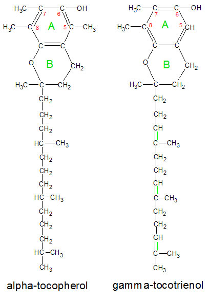 There are two groups in the vitamin E family, each of which has four members called alpha, beta, gamma and delta. The groups are called the tocopherols and the tocotrienols, so you get individual molecules with compound names like alpha-tocopheral. The groups are defined by whether or not the string of carbon atoms attached to ring structure B (see the diagram) is fully saturated with hydrogen atoms. The tocopherol group's carbon chain is fully saturated, while the tocotrienol group has partially unsaturated carbons. Every forth carbon in the tocotrienol chain is connected to the next carbon by a double bond (shown in green) due to the missing hydrogen atoms.