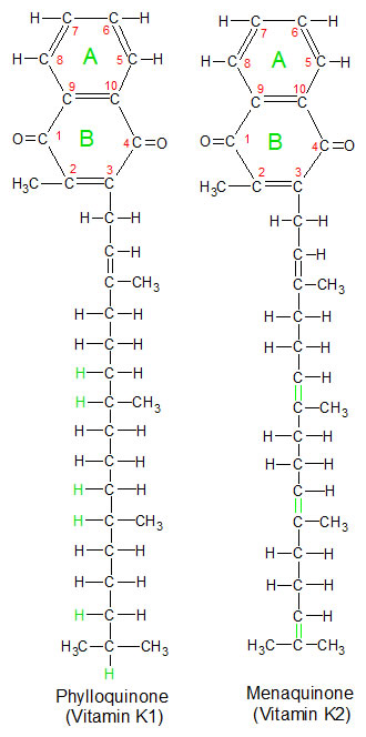 They differ only in the carbon chain attached to the ring structures. Since they are so similar in their biological activities, I'll refer to both of them as vitamin K for the rest of this article.