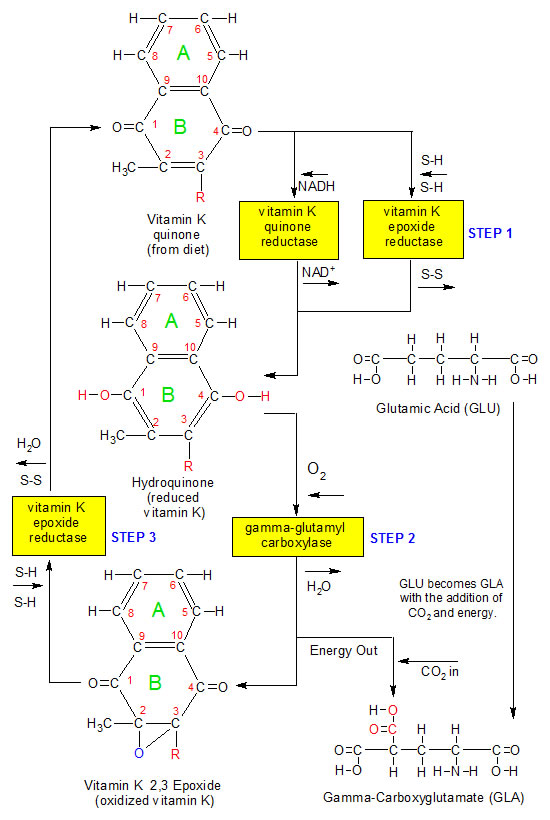 The diagram below maps out a process called the vitamin K cycle. This same cycle is used on all GLA domain proteins, whether the final result is clotting of the blood, deposition of calcium in the bones or some other process. The ring portion of the vitamin K molecule is shown in the three forms that it takes during this cycle. To save space, I've replaced the carbon tail with the red letter R. You can see the tails for vitamin K1 and K2 in the diagram above this paragraph. The tails are not important in this process because the active areas on vitamin K are the H and O atoms attached to carbons 1 and 4 in the B ring structure. None of the protein molecules that contain a GLA domain are pictured in the diagram, but a single amino acid from a GLA domain is shown in both its GLU and GLA form. Let's go through the vitamin K cycle step by step.