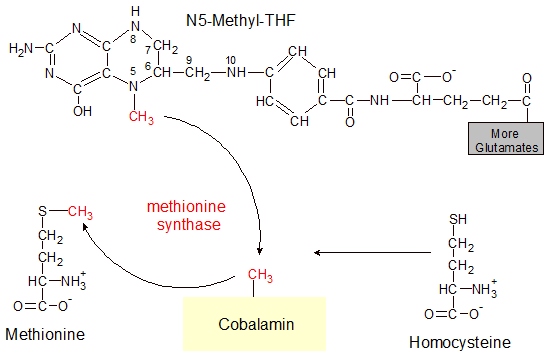 In our example of how cobalamin works, an enzyme called methionine synthase transfers a methyl (CH3) group from a molecule of N5-methyl-THF (one form of vitamin B9) to cobalamin, producing a molecule of methylcobalamin. This is an intermediate step in the transfer of a methyl group to homocysteine, which converts it into methionine. Methionine is one of the twenty amino acids that are used in protein. Methionine synthase can't transfer the methyl group directly from N5-methyl-THF to homocysteine, so cobalamin acts as an intermediate transfer point.