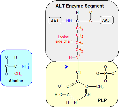 Step 1: Transamination begins when the green bond between PLP's carbon atom and lysine's epsilon amine group is severed in a hydrolysis reaction that restores PLP's aldehyde (H-C=O) group (not shown). Alanine binds to PLP's aldehyde group in a condensation reaction, forming the ketimine molecule shown below. The alpha amine groups are blue and the amino acid side chains are red. AA1 and AA3 are amino acids adjacent to lysine in the ALT enzyme.