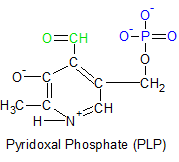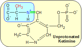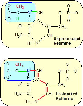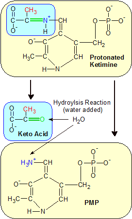 Step 3: Hydrolysis severs the green C=N+ bond again, but this time the double bond is on the other side of the nitrogen atom. Alanine is now a keto acid because the amine group was replaced with a keto group (the green double-bonded oxygen). PLP gained the amine group and is now Pyridoxamine phosphate (PMP). |