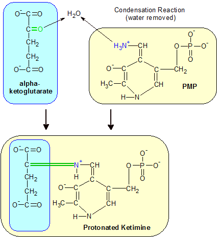 Step 4: An alpha-ketoglutarate keto acid's keto oxygen atom combines with PMP's amine group to form a new C=N+ double bond. A new protonated ketimine molecule is formed. |