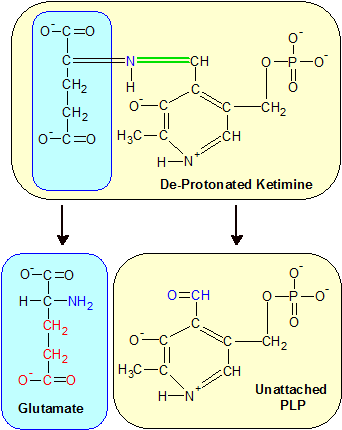 Step 5: The ketimine molecule deprotonates, moving the green double bond back to the PLP side of the molecule. Hydrolysis separates the two molecules again, but this time the amine group stays with alpha-ketoglutarate, producing an amino acid called glutamate. PMP reverts to PLP, which is shown here with its aldehyde group (blue) unattached to any amine group. |