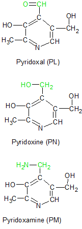 Vitamin B6 refers to a family of molecules that share a common ring structure. The three molecules vary only in their attached functional groups. Pyridoxine (PN), Pyridoxal (PL) and Pyridoxamine (PM) are the three unphosphorylated molecules, but each has a phosphorylated version abbreviated as PNP, PLP and PMP respectively. All six of these molecules can be converted into each other as needed, but the ring structure itself can't be assembled in people.