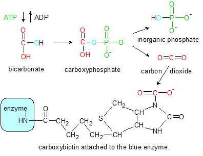Note the blue oxygen atom in the Step One diagram. ATP adds a phosphate group with three oxygens to bicarbonate, but removes the four oxygen (inorganic) version of phosphate from caroxyphosphate. This removes the extra oxygen from bicarbonate, converting it to carbon dioxide. The carbon dioxide then binds to biotin's nitrogen atom as a carboxyl group. The end result is a molecule called carboxybiotin.