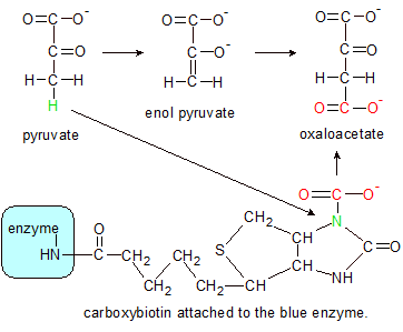 Step 2: This step begins when the unattached end of carboxybiotin (containing the carboxylated biotin ring structure) swings over to the enzyme's second active site where it reacts with pyruvate in another multi-part process. Pyruvate donates a hydrogen atom (green in the step 2 diagram) to biotin's green carboxylated nitrogen atom. This severs the C-N bond, restoring biotin to its original uncarboxylated state and converts pyruvate into an enolate form. The severed carboxyl group (red) converts to a molecule of carbon dioxide (not shown), which then converts back into a hydroxyl group as it binds to the end of the enolate form of pyruvate where the hydrogen atom used to be. This converts pyruvate into a molecule of oxaloacetate. Its job complete, biotin then swings back to the first active site where it starts the process all over again.