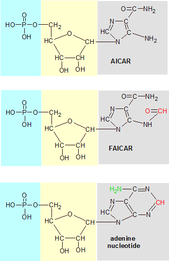 N10-formyl-THF (not shown) transfers a formyl group (O=CH) to AICAR, transforming it into FAICAR. The oxygen is discarded later, but the carbon remains as a permanent addition. The first two images are intermediate molecules with the purine double-ring structure under construction. The third image is an adenine nucleotide. Its nitrogenous base (gray) is a completed purine structure with an extra nitrogen atom (green) added to make it adenine. The phosphate (green) and deoxyribose (yellow) areas are the same in all three images. |