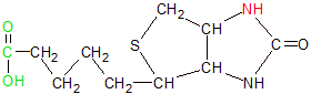 Biotin uses its carboxyl-tipped (green) tail to bind to a lysine residue on an enzyme and its red nitrogen to transfer carboxyl groups to other molecules. |