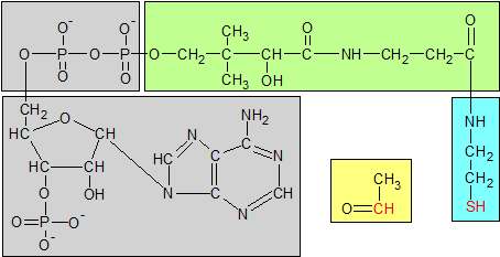 Coenzyme A has three parts. Phosphoadenosine diphosphate is gray, pantothenic acid is green and b-mercapto-ethylamine is blue. B-mercapto-ethylamine is the active part of coenzyme A. Its red sulphur atom binds to the acetyl group's red carbon atom to form acetyl CoA. The acetyl group is yellow. Pantothenic acid is a structural component of coenzyme A, not an active one. |