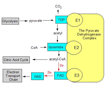 The yellow pyruvate dehydrogenase complex is made up of multiple copies of three different enzymes. The substrates (the black text without boxes) are modified using molecular tools (in the blue boxes). The gray boxes represent processes that produce or use the substrates. The red arrows with 2e- show how FAD accepts two electrons and then passes them on to NAD. |