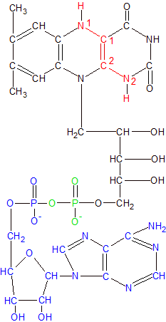 FADH2 is the reduced form of FAD. Remove the blue section to get FMNH2. Riboflavin is in red and black. |