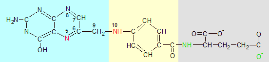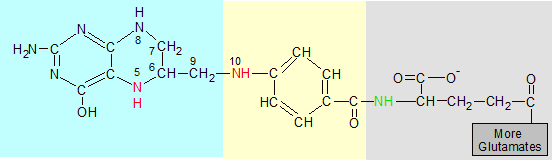 Folates are a family of molecules that are derived from folic acid, but may exist in any number of altered states brought about by the partial or complete reduction of folic acid (by adding hydrogen atoms), or the binding of additional glutamates. Animals (including humans) can convert folates from one state into another, but we can't synthesize the pterin ring structure from scratch. Plants are able to do this, and provide pre-assembled folates in our diet. The most biologically significant folate is called tetrahydrofolate (THF), so I'll use it to describe the two types of changes that occur during the transformation of folic acid into a folate.