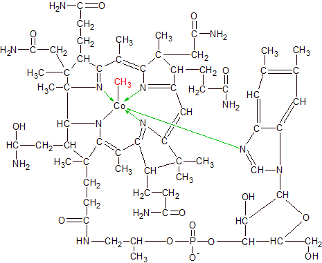 Cobalamin has the most complex structure of all the vitamins. It has a cobalt (Co) atom bound to the center of a multi-ring structure with many additional attached groups. The cobalt atom is bound to the structure by six covalent bonds, four of which are coordinate bonds. A covalent bond occurs when two atoms each share one unpaired electron in order to form an electron pair. A coordinate bond is a covalent bond where one atom provides both of the electrons for the pair. In cobalamin's case all four of its coordinate bonds are formed when four nitrogen atoms each donate an electron to the cobalt atom and then form a covalent bond with it.