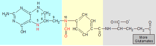 Folic acid (above) is made up of pterin (blue), p-aminobenzoate (yellow) and glutamate (grey) sections. Tetrahydrofolate (THF) (below) is folic acid with four extra hydrogens in the pterin ring and additional glutamate groups added to its gray end. The red nitrogen atoms grab single-carbon groups when they are released from amino acids by enzymes.