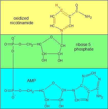 NAD+ is one of the oxidized forms of NAD. The other is NADP+. In this state it's ready to receive two electrons, one of which arrives as a hydrogen atom. To see what it looks like with the extra electrons, see the NADHP image. I have color-coded the sections that get combined at each stage in the formation of NAD+. The green and blue sections taken together form ADP ribose. |
