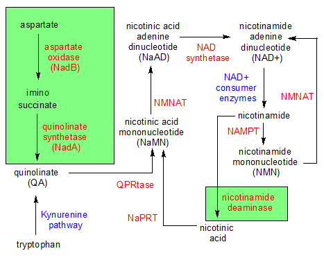 The niacin family of molecules. The molecules are black while the enzymes that change the molecules are red. The blue items are multiple enzymes or entire pathways and the green areas contain reactions that animals can't perform. |