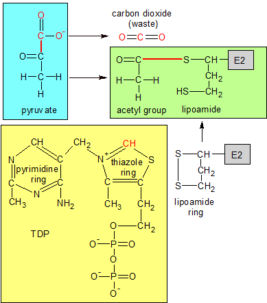 The process begins when pyruvate (which is produced by glycolysis) arrives at the PDC and attaches itself to an active site on E1. TDP, which is also attached to E1, uses its thiamin ring to decarboxylate pyruvate. A section of pyruvate containing two oxygens and one carbon is severed from pyruvate, creating carbon dioxide and an acetyl group.