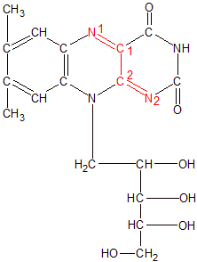 Riboflavin is shown here in an oxidized state. Its active site is in red. It must become part of FMN or FAD before it can participate as a cofactor with an enzyme in a chemical reaction. |